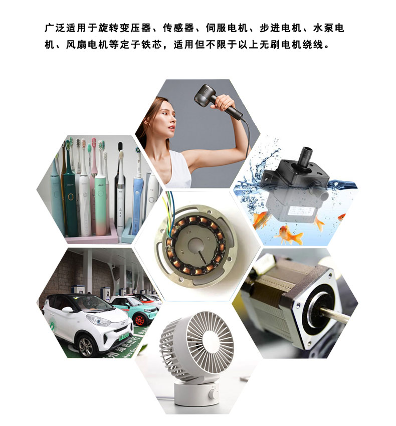 家用電器電機、醫(yī)療器械電機、工業(yè)風扇、水泵、新能源汽車、旋轉(zhuǎn)變壓器、傳感器、伺服電機、步進電機水泵電機、吸塵器電機、電動工具類電機等定子鐵芯,適用各類無刷電機繞制。