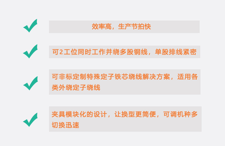 ◆ 可2工位同時工作并繞多股銅線,單股排線緊密 ◆ 可非標定制特殊定子鐵芯繞線方案,適用各類外繞定子繞線 ◆ 夾具模塊化的設計,讓換型更簡便 ◆ 可調機種多、切換迅速,效率高,生產節拍快