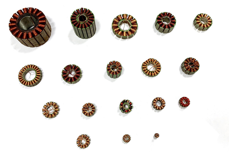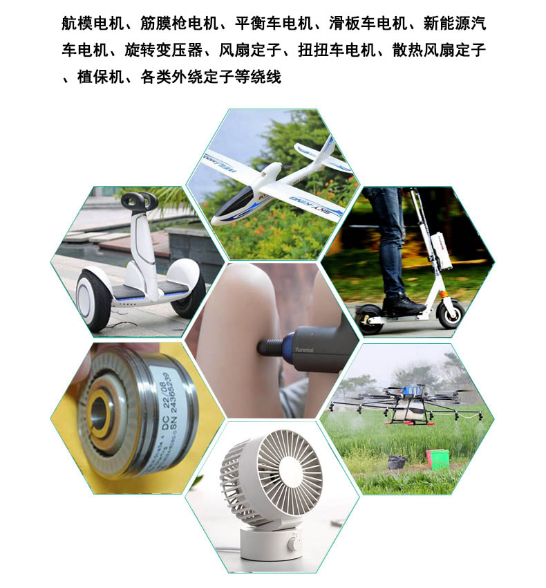 航模電機、平衡車電機、滑板車電機、新能源汽車電機、旋轉變壓器、風扇定子、扭扭車電機、散熱風扇定子、植保機、各類外繞定子等繞線